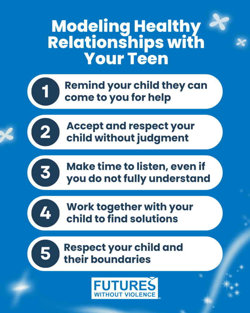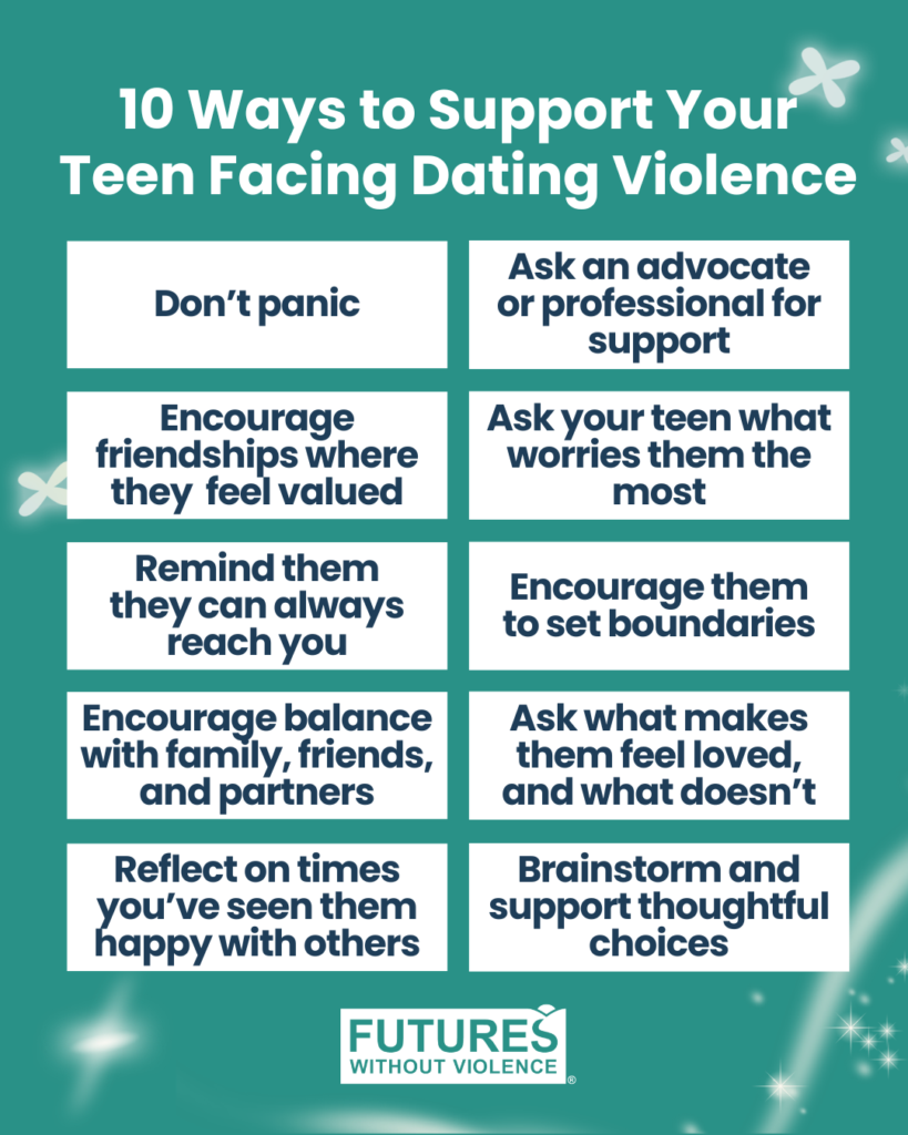 If you are concerned your teen is experiencing dating violence, contact the Love is Respect hotline at 1-866-331-9474 or text “LOVEIS” to 22522 for support.