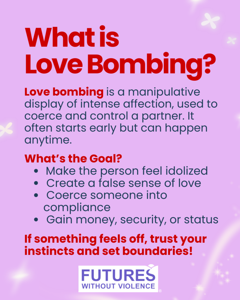 - Love bombing is a pattern of behavior involving targeted demonstrations of affection and excessive attention. This can look like a partner giving your teen a lot of gifts or making a big show of their affections.